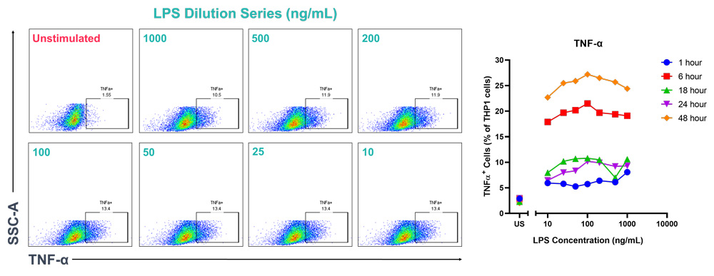 Following PMA differentiation, THP1 cells were stimulated with a lipopolysaccharide (LPS) dilution series for several time points (1, 6, 18, 24 and 48 hours). Following set incubation with LPS, and a protein transport inhibitor to prevent cytokine release, cells were stained for TNF-α production (using intracellular staining), with results indicating that 6- or 48-hour stimulation is optimal for TNF-α production.