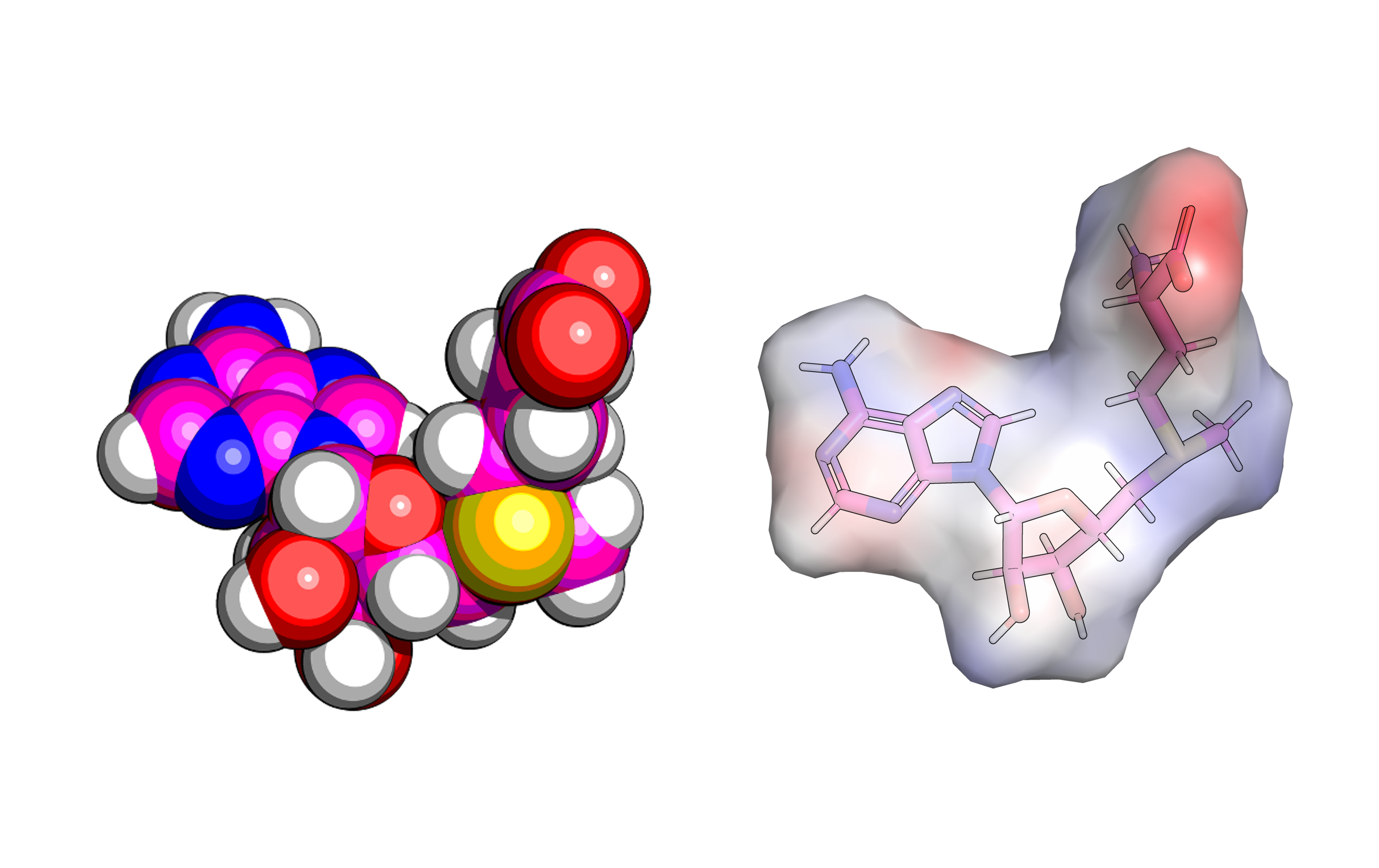 Figure 1. Shape and electrostatic model of S-adenosyl methionine (SAM, top) and SAM-VI-RNA binding model (bottom)
